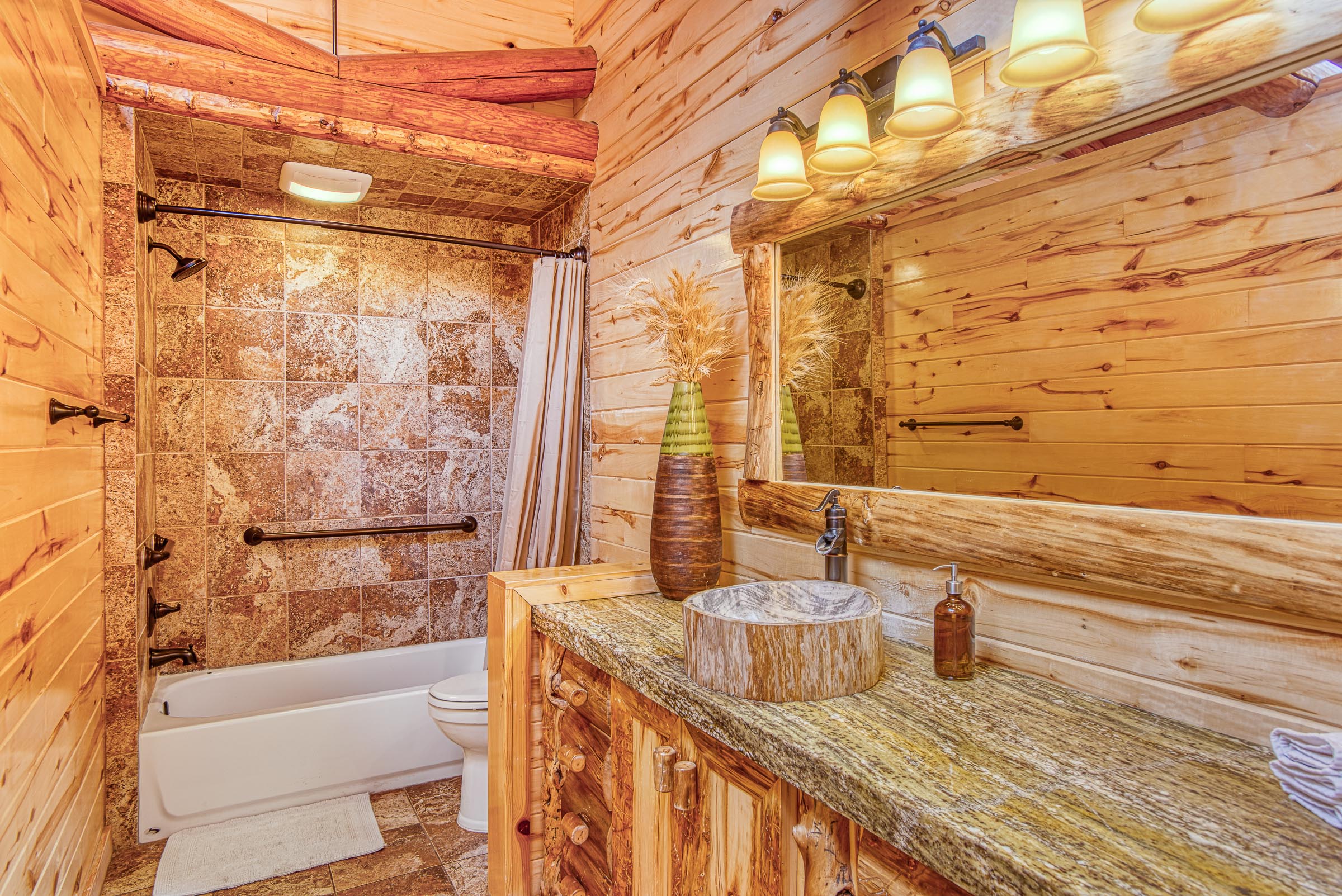The Utah Room has 4 custom-made queen bunk beds, aspen wood dresser, and large chair with ottoman. It is adjacent to the Game Room. Bathroom has three compartments: toilet with sink, walk-in shower,